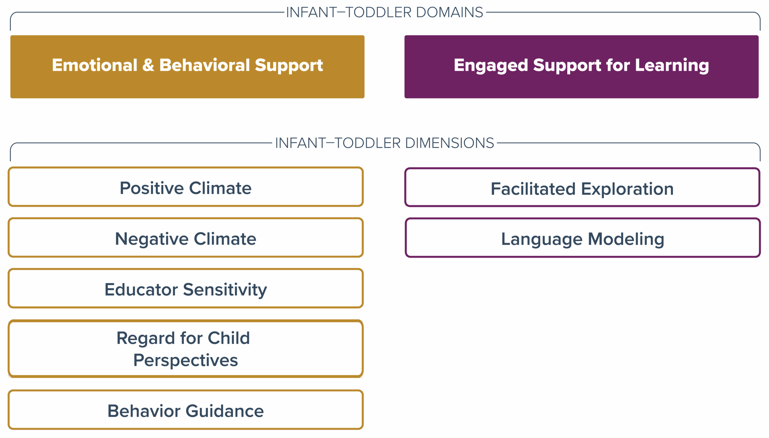 Below, you can see how the domains and dimensions are organized in the CLASS® 2nd Edition Infant–Toddler tool and the CLASS® 2nd Edition Pre-K–3rd tool.